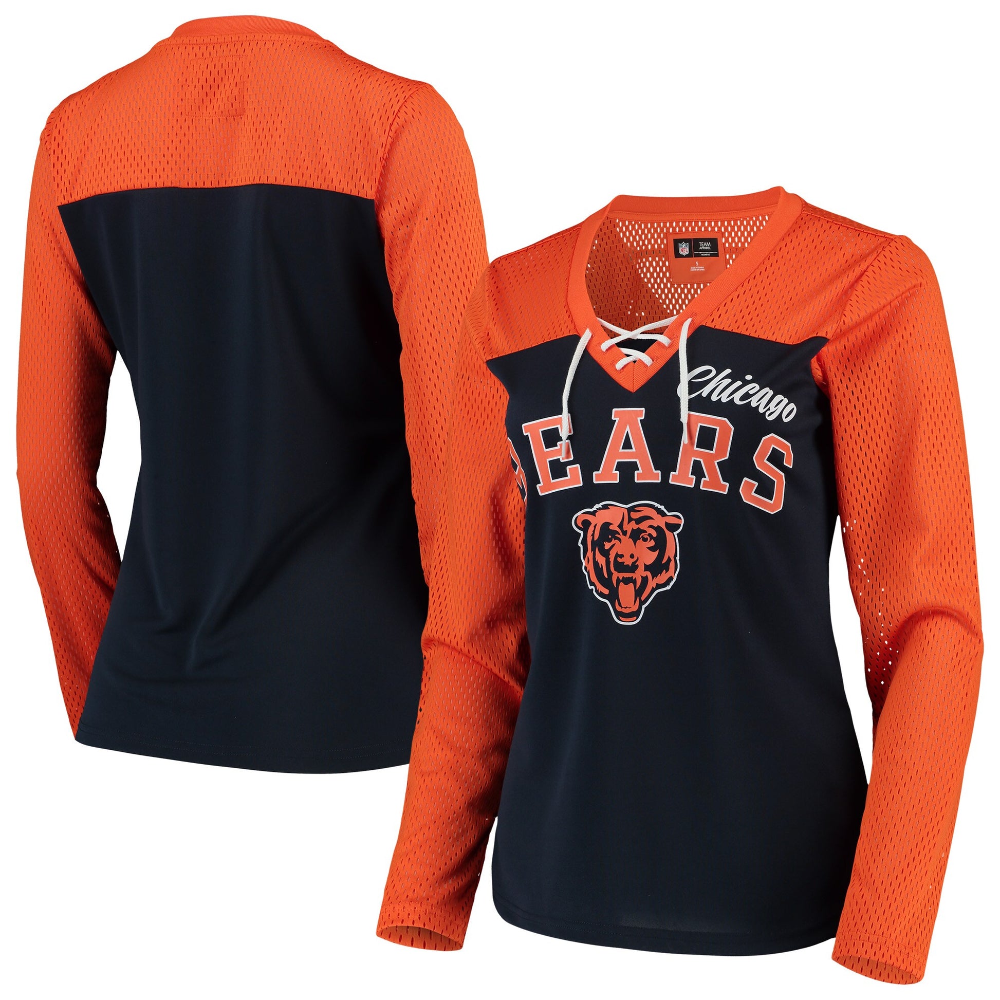 Celebrate with your Chicago Bears in this long sleeve Laces Out Shirt. This shirt features a screen print team name and logo in bold print across the chest. Shoe lace style near neck, Mesh accented sleeves. Don't see your size email and will double check for you.