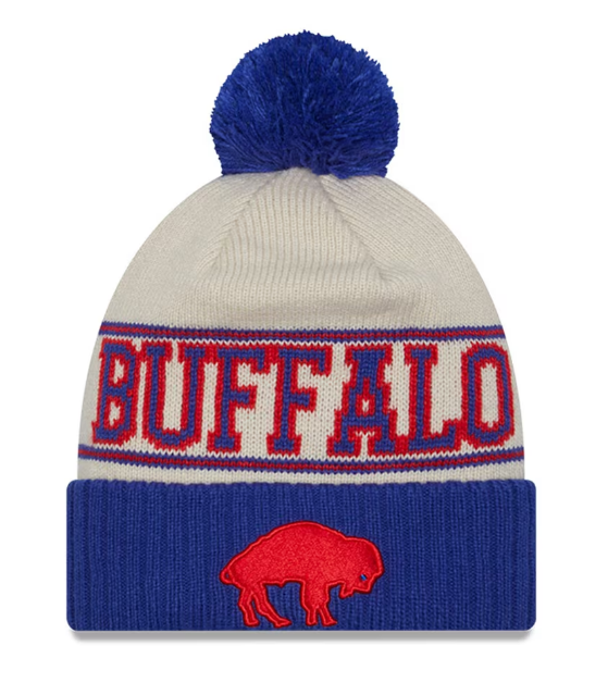 Buffalo Bills New Era 2023 Sideline Historic Pom Cuffed Knit Hat - Cream/Royal