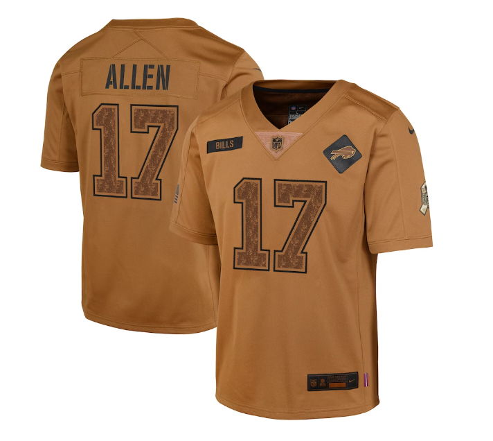 Your young fan can honor our service members while supporting the Buffalo Bills with this Josh Allen 2023 Salute To Service Limited Jersey. This Nike gear features a military-inspired color scheme with an American Flag patch on the right sleeve and the Salute to Service ribbon on the other. Complete with striking Bills graphics and camouflage details, this jersey will have your kiddo ready for gameday. The NFL does not profit from the sale of Salute to Service products. Charitable contributions are awarded by the NFL Foundation to the NFL's military nonprofit partners. For more information, please visit www.NFL.com/causes/salute.