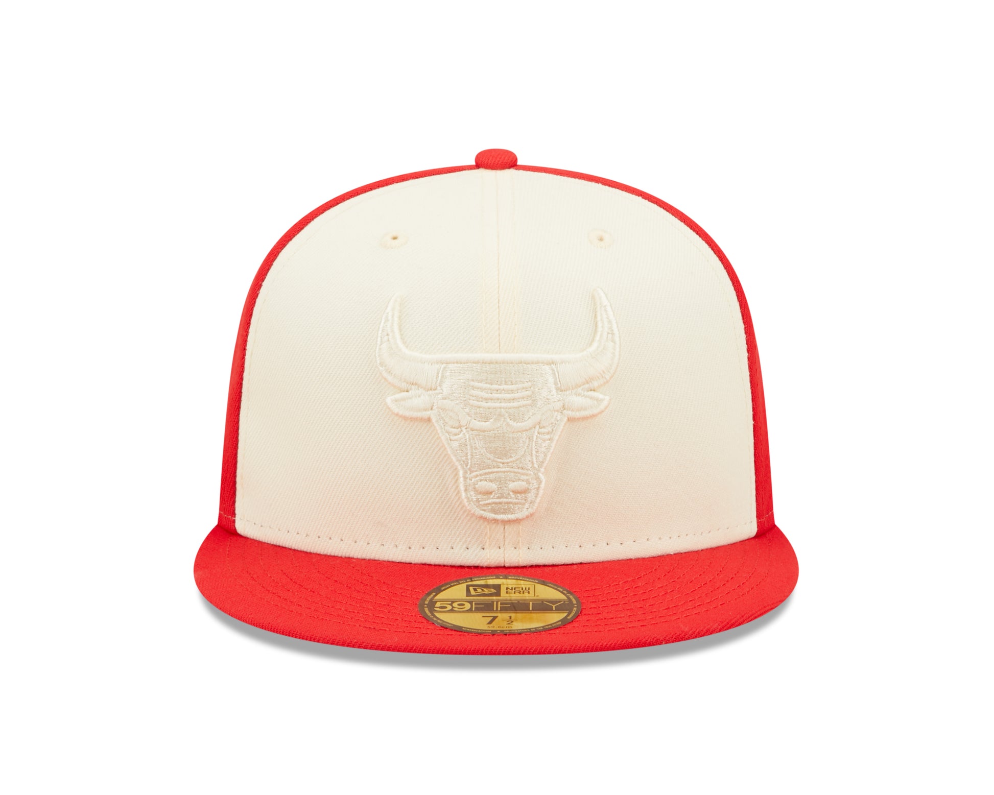 Bulls Fans !!. Show off in this Tonal 2-Tone Red 59FIFTY Fitted hat. This fitted hat features Bulls Logo on the crown in a tonal cream color and NBA logo on the back. The 59FIFTY® cap is New Era's signature fitted cap. It is a structured cap with a flat visor, that has the ability to curve. The 59FIFTY® cap has a full crown and six panels. The cap has eight rows of visor stitching and a button on top.