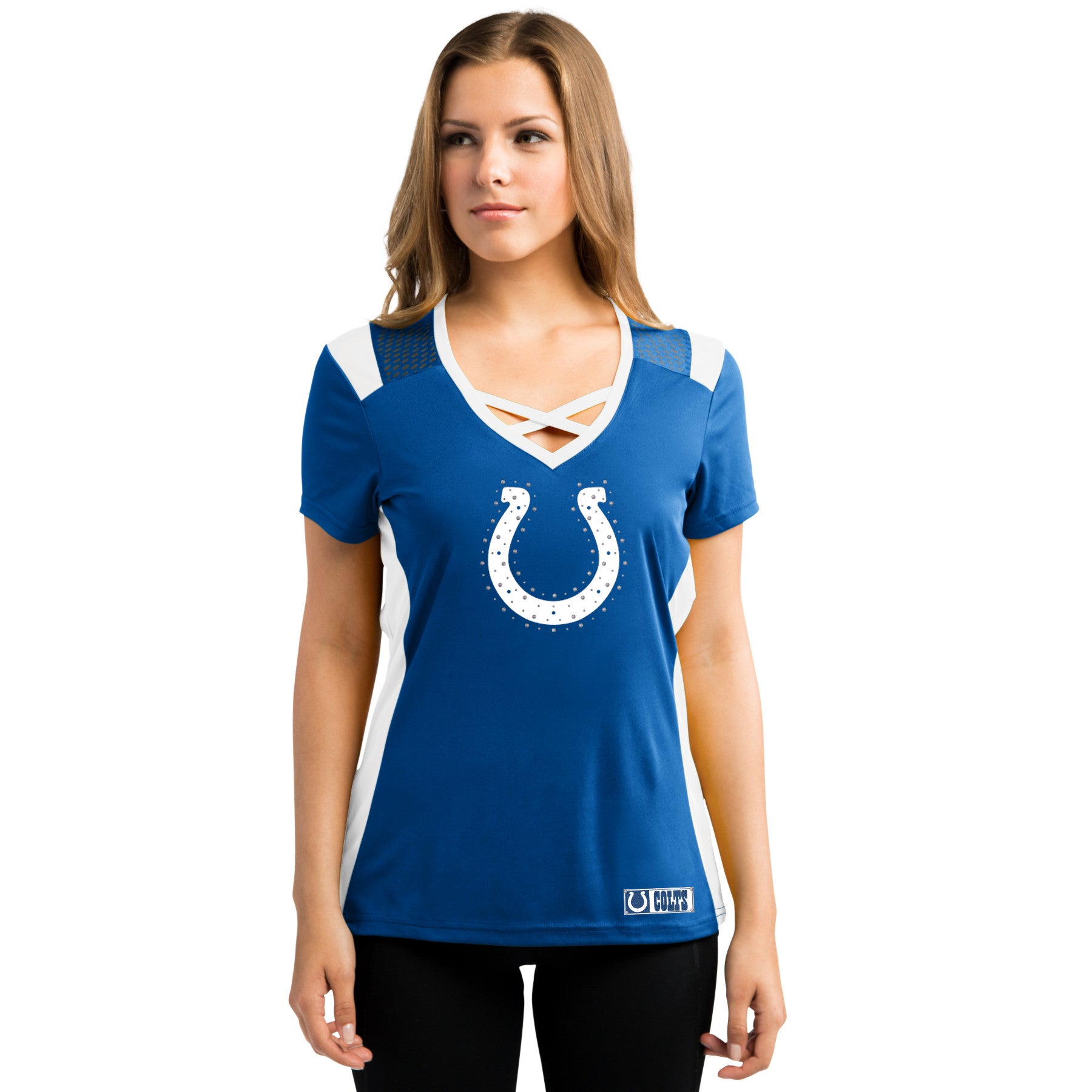 Hey Gal's to show off your Colts Pride with this Draft Me V-neck Jersey! It boasts a team logo on the front with studded application around on on logo. Left hip has a jock tag style application. Shoulders and the top of the back feature a mesh style for a athletic look.