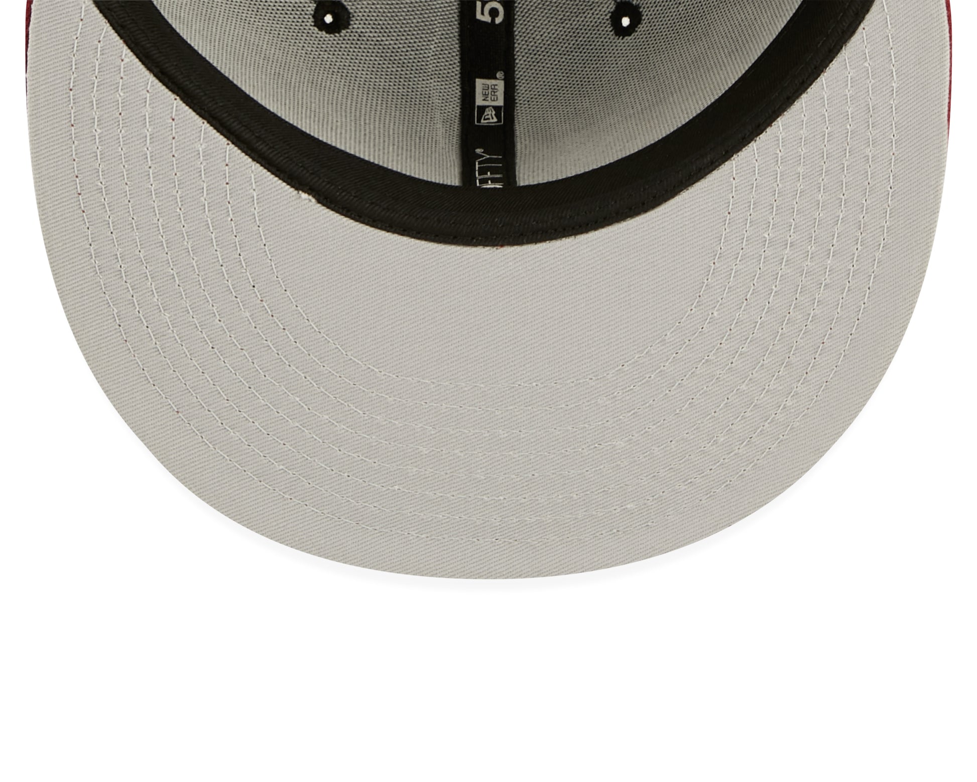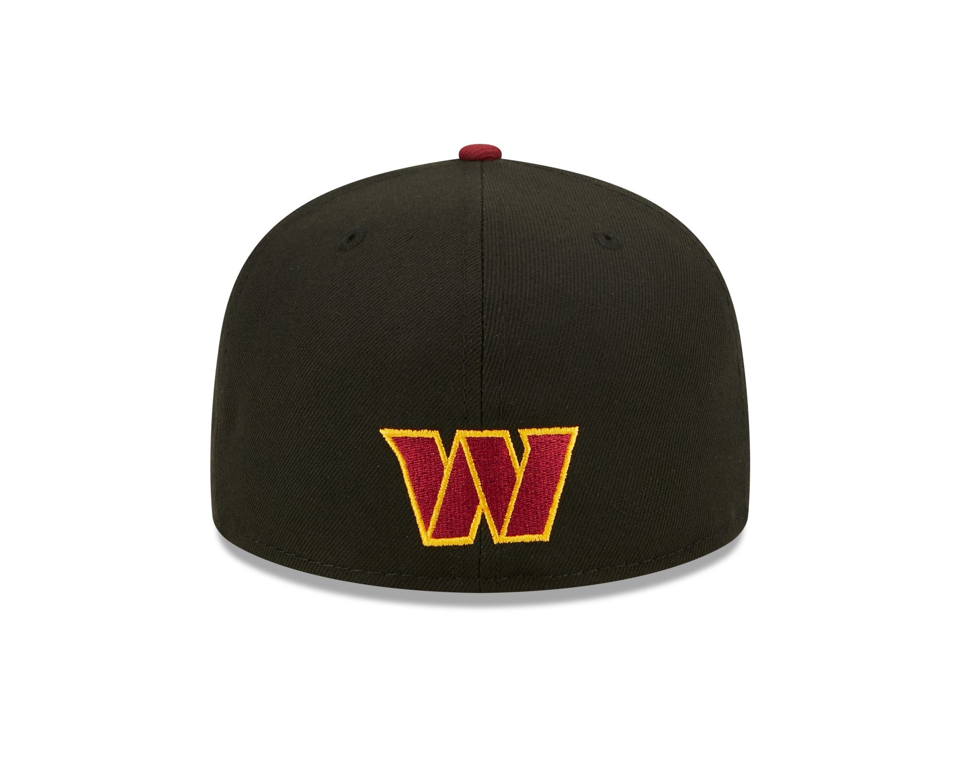 Authentic and ORIGINAL 59Fifty fitted hat by New Era, Black authentic poly deep crown and burgandy visor, light grey undervisor, flat embroidered angled team name with raised embroidered city script on front, embroidered NFL shield logo on side in team colors, embroidered New Era logo on opposite side, embroidered team logo on back in team colors, The 59FIFTY hat worn during the 2022 NFL Draft. This Washington Commanders cap is made by New Era and is licensed by the NFL National Football League.