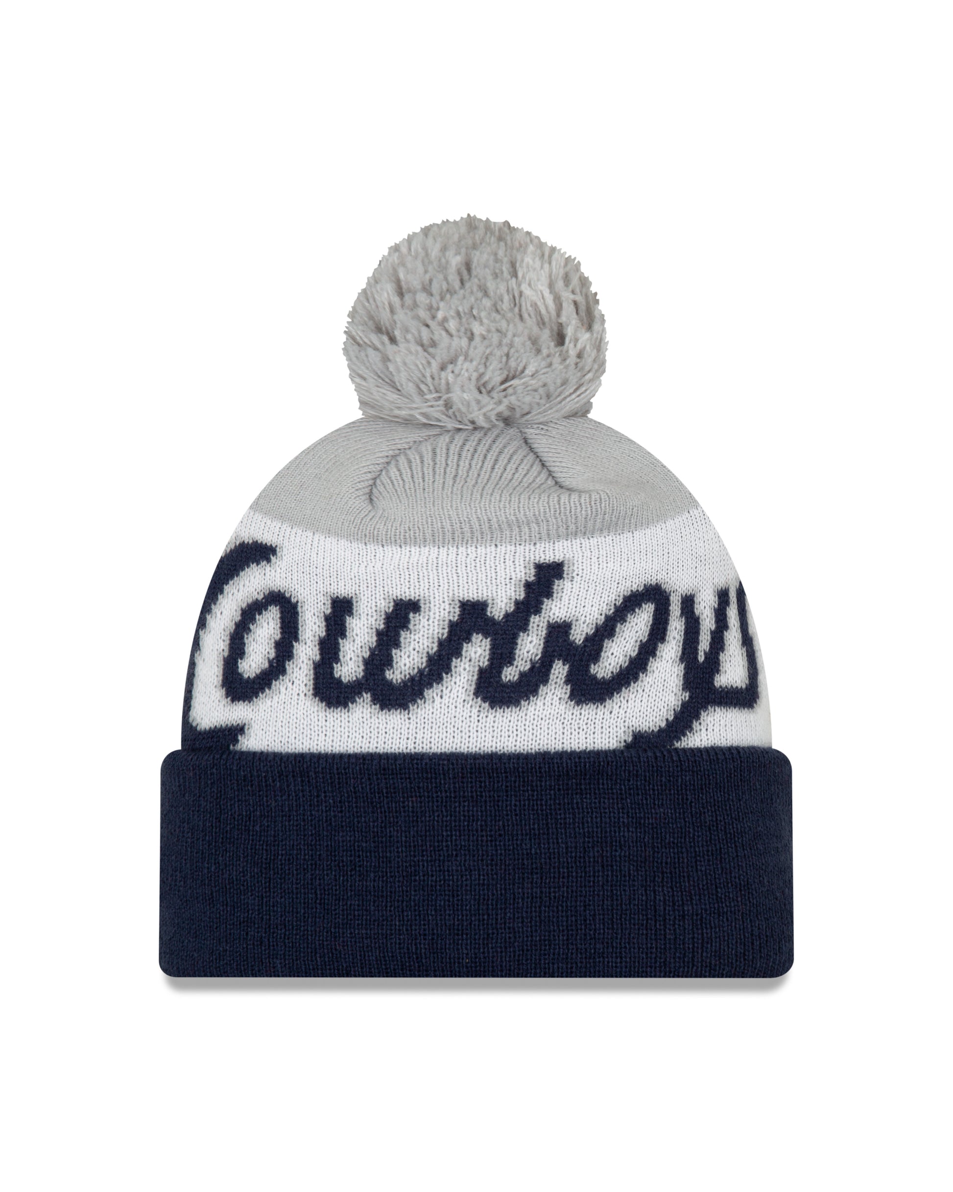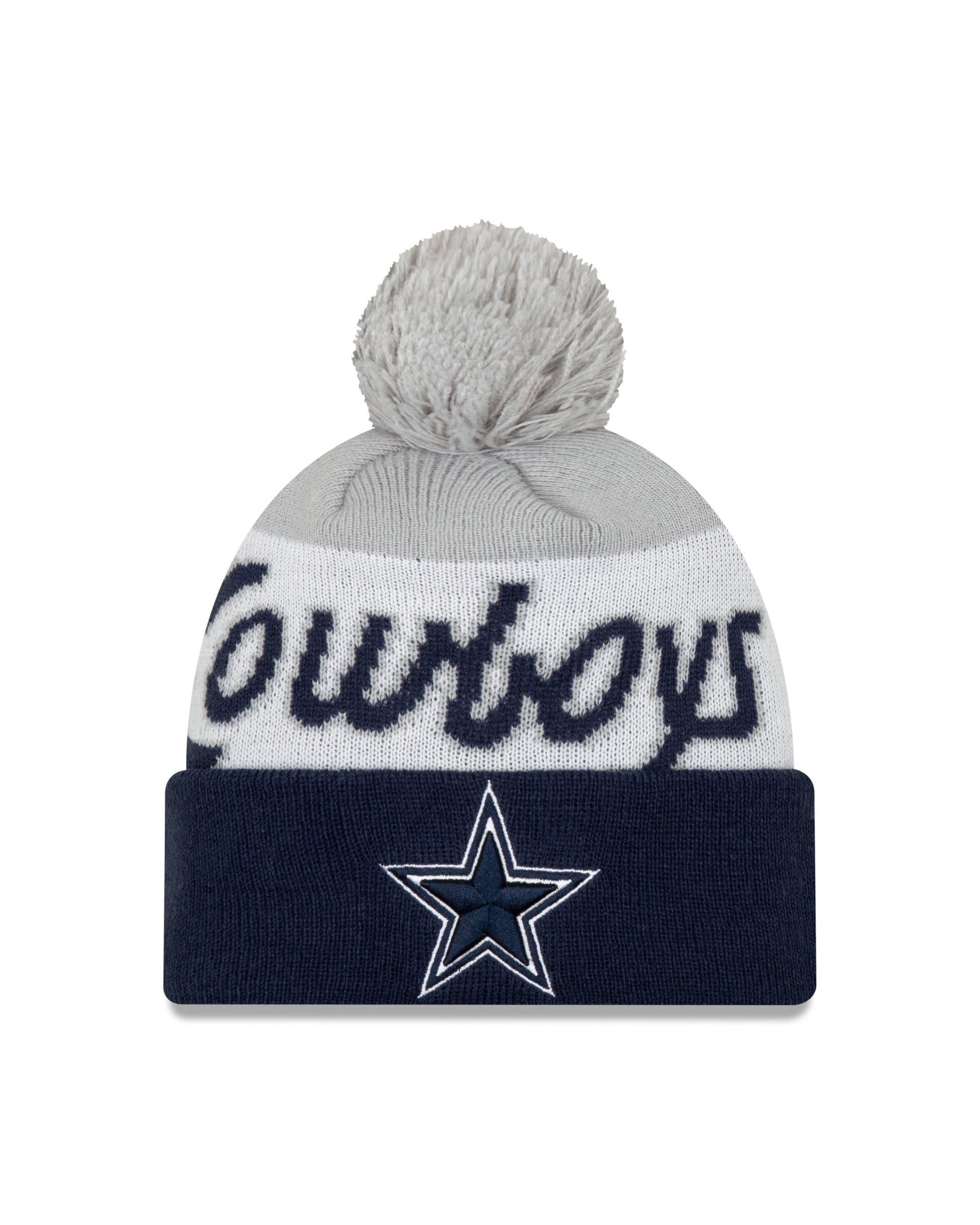 This Dallas Cowboys New Era cuffed script Pom knit hat is essential for any fan venturing out in the cold weather. Its vivid embroidered graphics will help you stand out in the stadium while everyone's all bundled up rooting for the Dallas Cowboys!