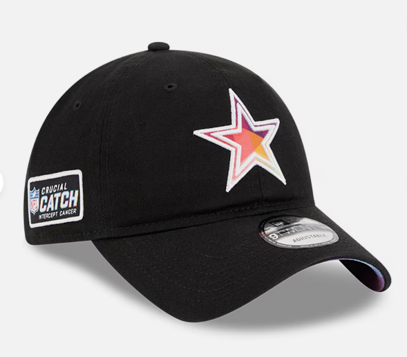 Intercept cancer with the 2023 NFL Crucial Catch Collection from New Era. In the spirit of various cancer ribbon colors, this 9TWENTY Adjustable Hat features an embroidered Dallas Cowboys logo at the front panels and a patterned undervisor. It also consists of the league's Crucial Catch logo at the right-wear side on a woven label and a strap closure at the rear. The NFL does not profit from the sale of Crucial Catch products. Charitable contributions are awarded by the NFL Foundation to the American Cancer Society. For more information, please visit www.NFL.com/CrucialCatch