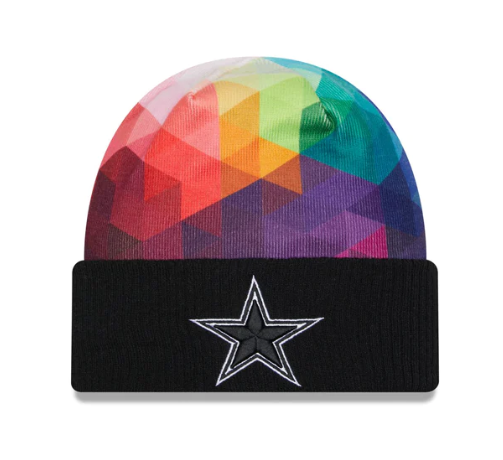 Intercept cancer with the 2023 NFL Crucial Catch Collection from New Era. In the spirit of various cancer ribbon colors, this Cuffed Knit Hat features an embroidered Dallas Cowboys logo at the front of the cuff and a patterned crown. The rear cuff features the league's Crucial Catch logo on a woven label. The NFL does not profit from the sale of Crucial Catch products. Charitable contributions are awarded by the NFL Foundation to the American Cancer Society. For more information, please visit www.NFL.com/CrucialCatch