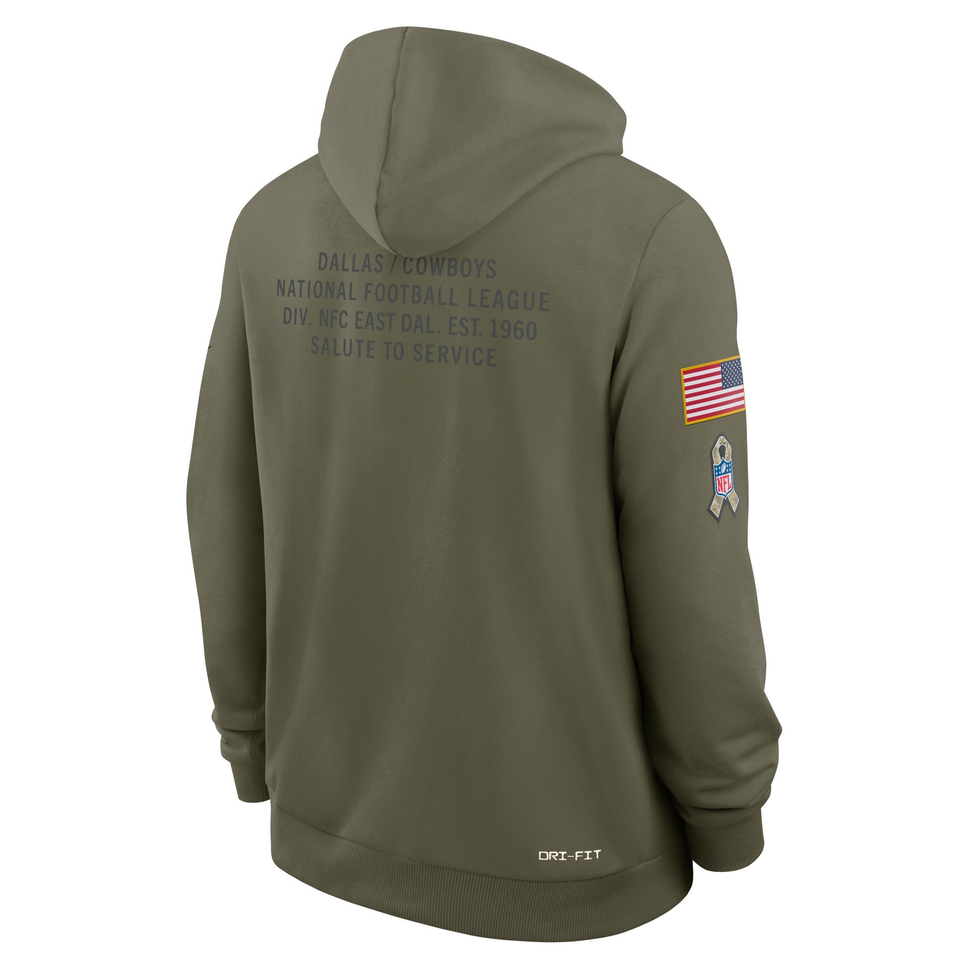 Join the Dallas Cowboys in supporting those who bravely serve our country with this 2025 Salute to Service Sideline Standard Issue Dri-FIT Hoodie by Nike. The military-inspired team details, American flag patch and Salute to Service ribbon are a symbol of gratitude and team spirit coming together. Crafted from heavyweight fleece fabric featuring sweat-wicking technology and a roomy fit, this Dallas Cowboys hoodie keeps you warm and dry while you pay tribute to our military heroes.