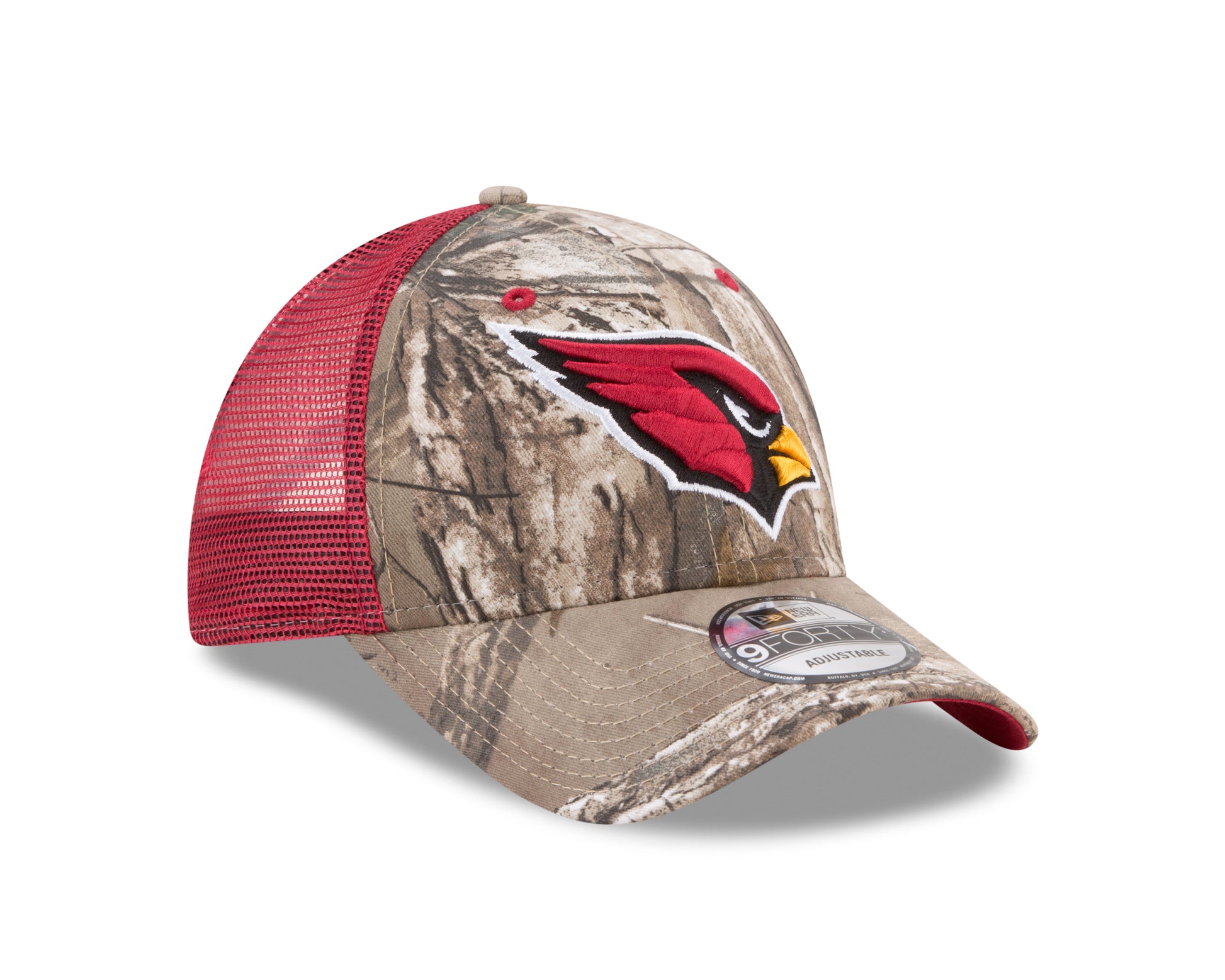 Cardinals fans!!! You'll want to sport this brand new Realtree Trucker Camo Mesh 9Forty Adjustable Snap back Cap. This cap features traditional logo in front. with adjustable snap back. Breathable mesh back with New Era logo on left side.
