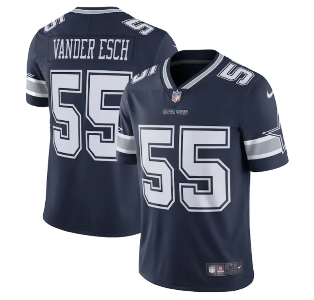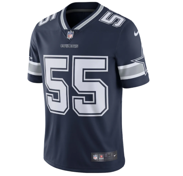 You know you are a true Cowboys fan! Your going to want to show off in this Nike Dallas Cowboys Limited "Dri-Fit" Jersey By Nike.. Inspired by the actual gear that Leighton wears on the field, this jersey boasts the Cowboys design The chainmaille mesh grill at the front neck with premium team detailing and back seam lines elevate the look to a new level. Nike "Dri-Fit technology that features a no-tag neck label that offers comfort and strategic ventilation, bold contrast color detailing, tackle twill player numbers and Vander Esch name on the back in tackle twill lettering .(tackle twill numbers and letters are stitched or embroidered on) Sleeves feature the Nike Swoosh. When going to the game or just showing off around town you'll want to sport this Limited Jersey to show off your True Cowboys pride.
