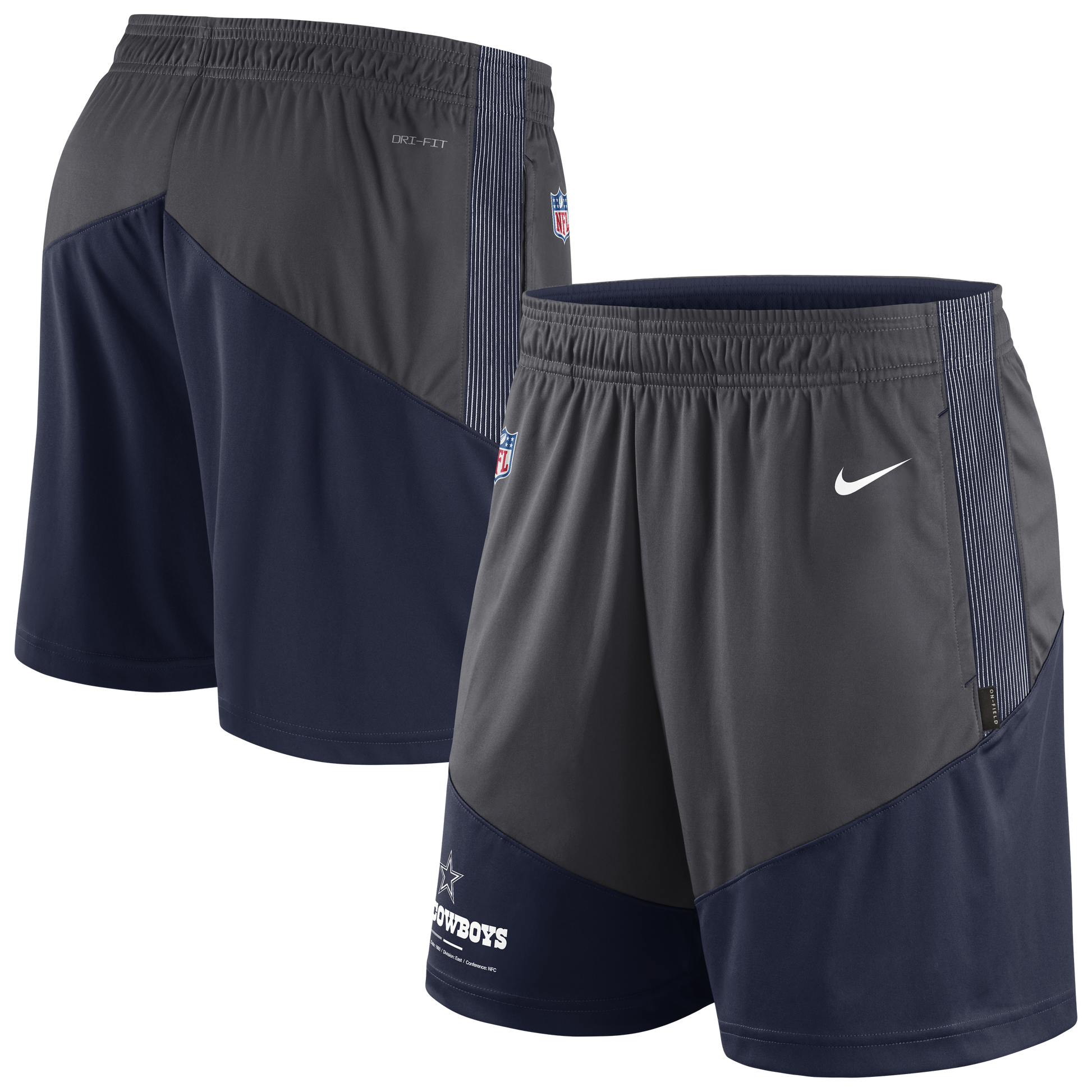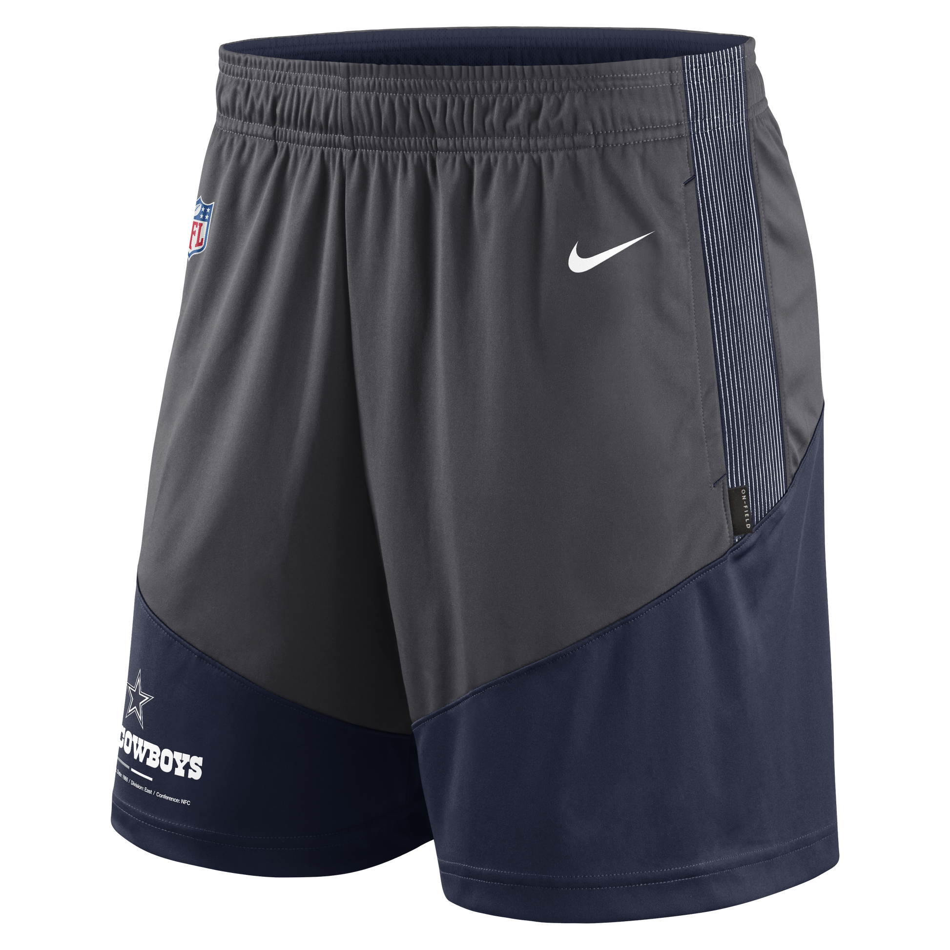 Show your Dallas Cowboys pride on the field or in the stands with these Nike Sideline Performance "Dri-Fit" Shorts. Crafted for both performance and comfort, these shorts are constructed using breathable "Dri-Fit fabric and feature an adjustable, elastic waistband. The hem splits and side pockets offer additional practicality, and the official team logos proudly showcase your Dallas Cowboys spirit.