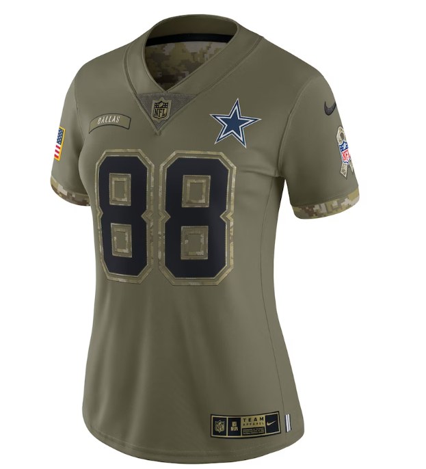 You know you are a true Cowboys fan! Your going to want to show off in this Woman's Nike Dallas Cowboys Lamb Salute to Service Jersey By Nike Inspired by the actual gear the players wear on the field, this jersey boasts the Cowboys design and features a no-tag neck label that offers comfort and strategic ventilation, bold contrast color detailing. Tackle Twill Name & numbers offer lightweight durability. Player name Stitched on the back. Sleeves feature the Nike Swoosh and Salute To Service Ribbon. Right Sleeve features American Flag. When going to the game or just showing off around town you'll want to sport this Game Jersey to show off your True Cowboys pride.