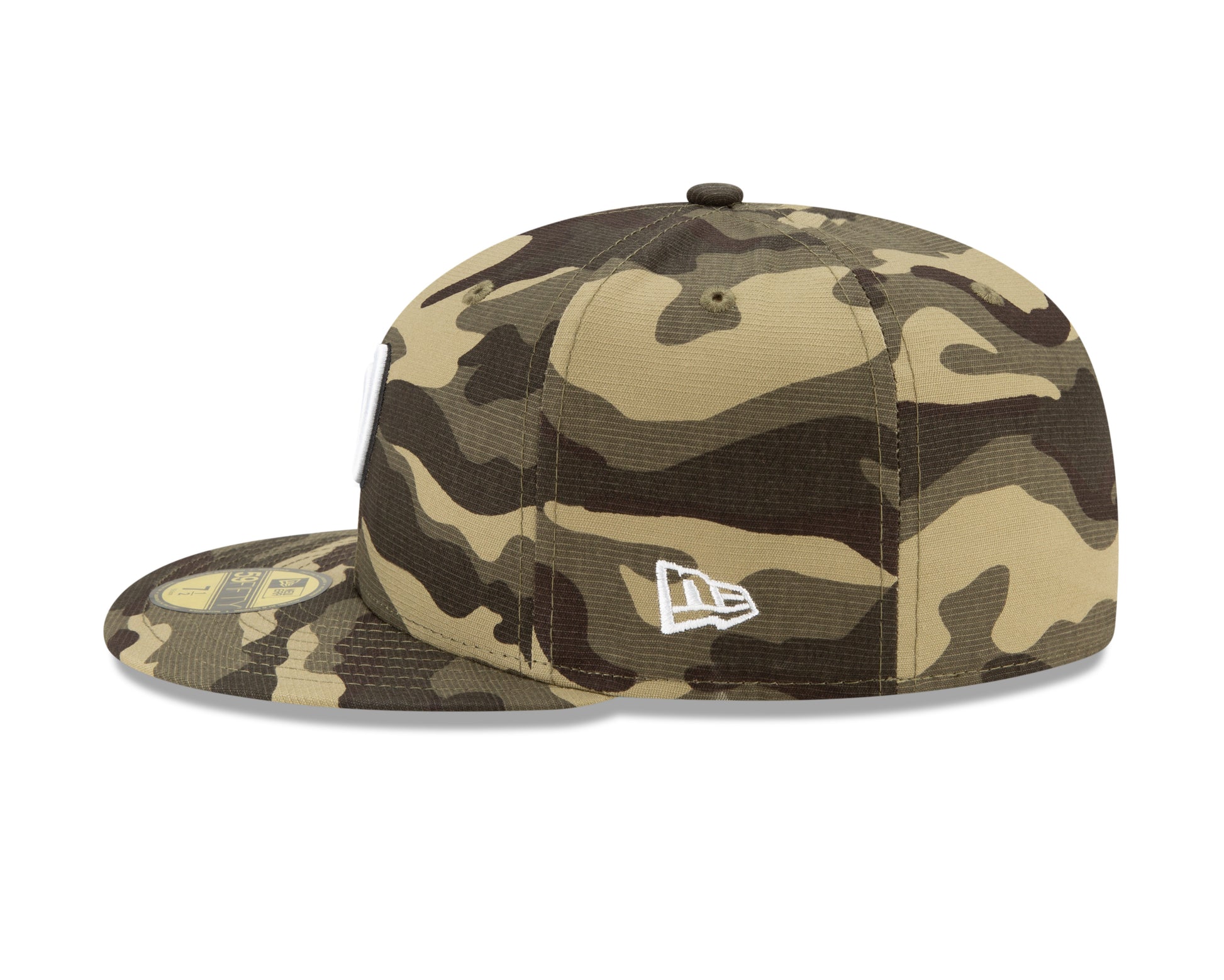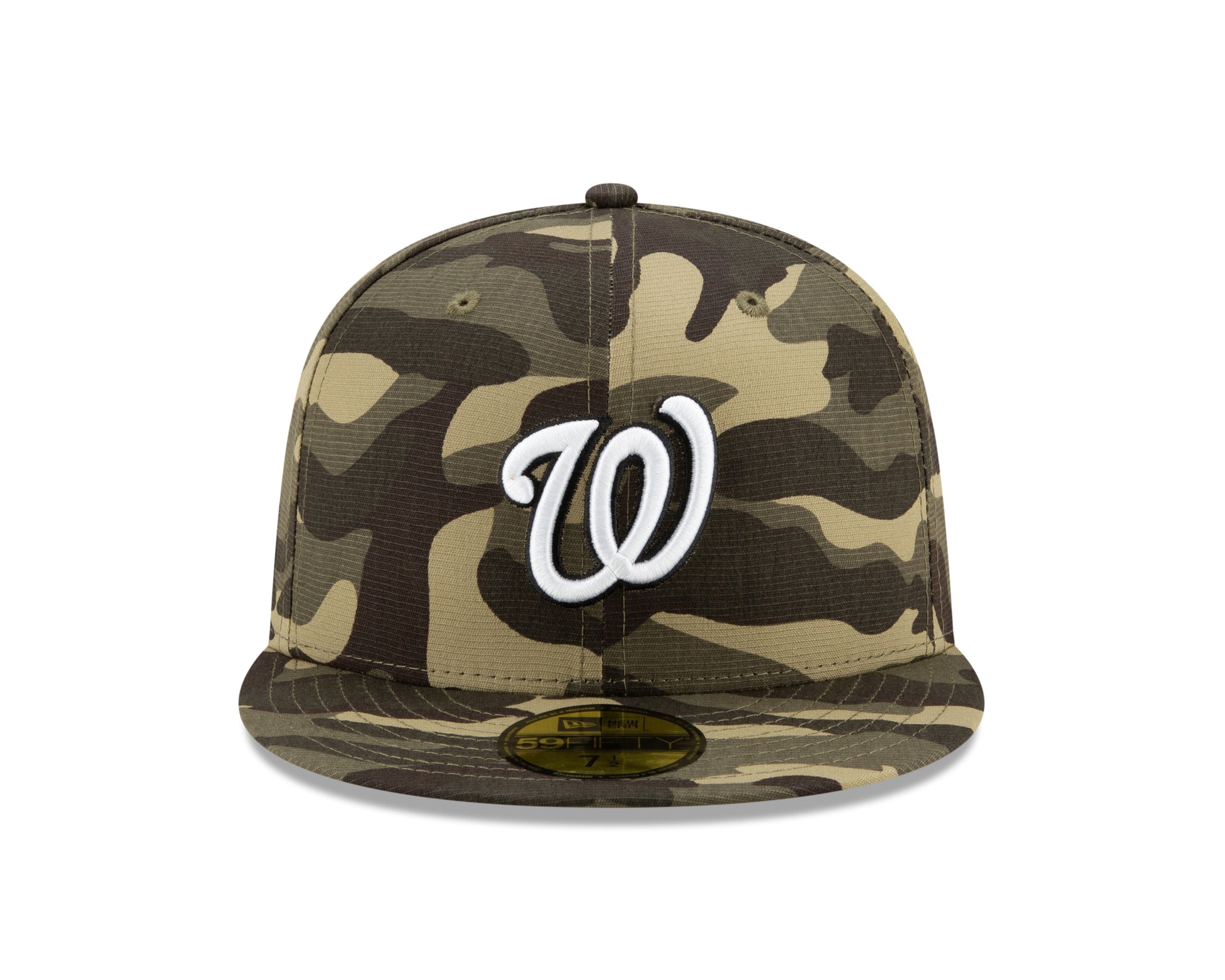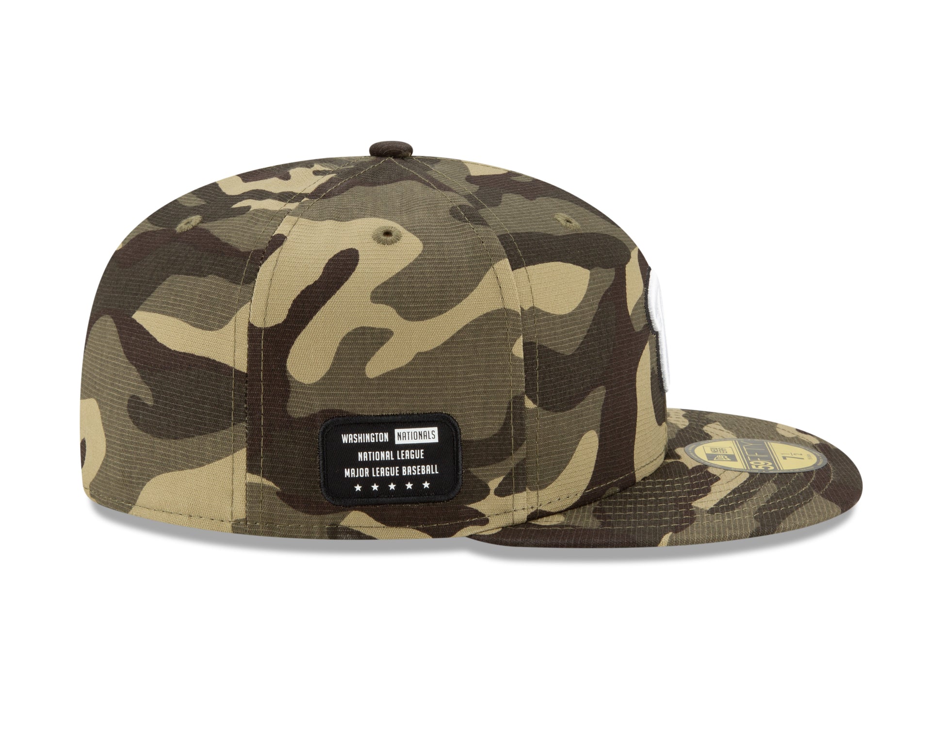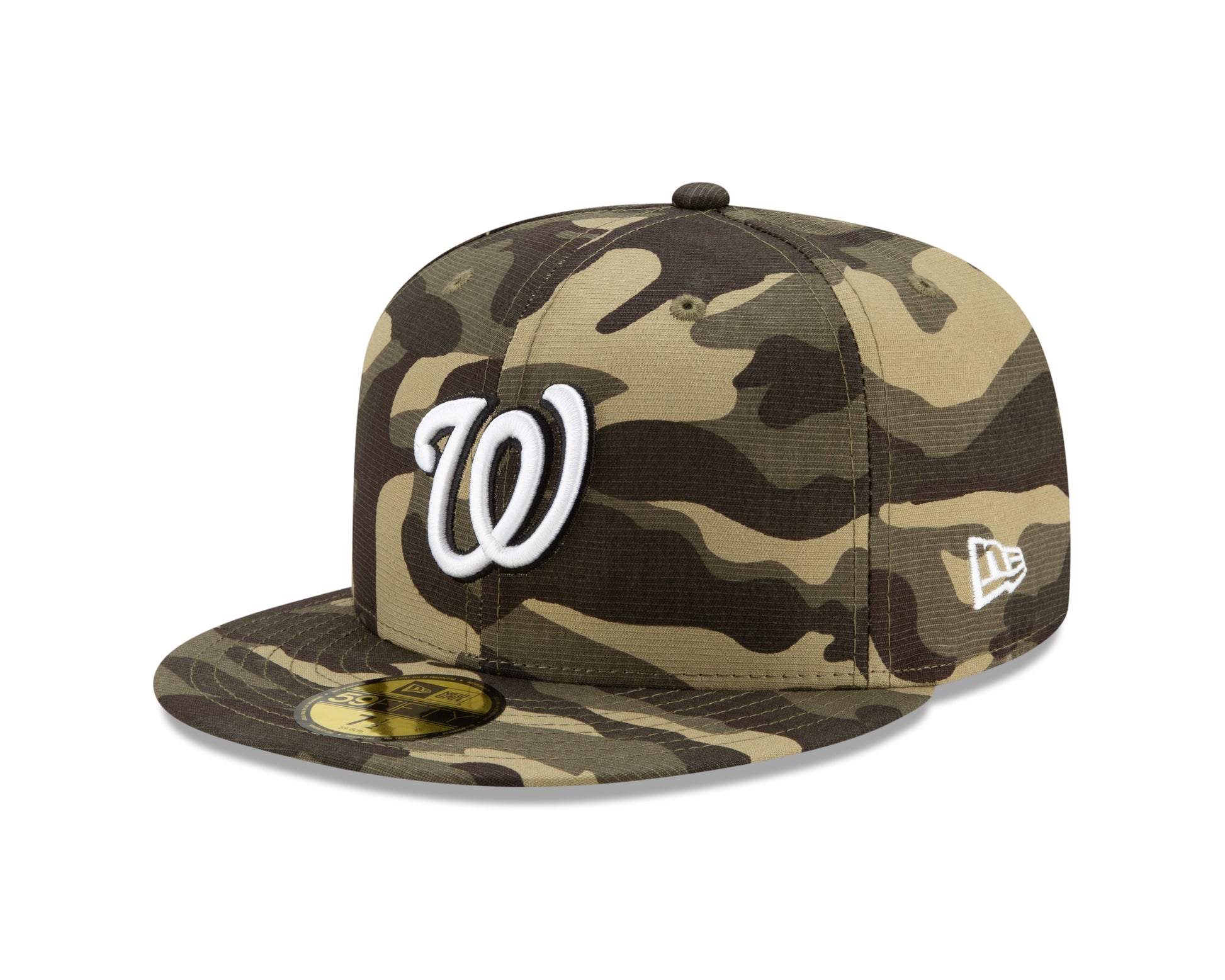 Nationals Fans !!. Sport this New Era Tan/Green Camo Armed Forces On-Field fitted Hat, 59FIFTY. This fitted hat features a 3D embroidered Team logo on crown. Stars on the right side and MLB logo on the back along with a cool flat bill and New Era’s flag on left side. This is the same hat you will see your favorite players wearing on Memorial day weekend. So don't just dream about those players wear one for yourself. The 59FIFTY® cap is New Era's signature fitted cap. It is a structured cap with a flat visor, that has the ability to curve. The 59FIFTY® cap has a full crown and six panels. The cap has eight rows of visor stitching and a button on top.