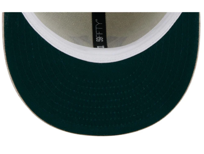 The New York Yankees Match Up 59FIFTY Fitted Cap features an embroidered Yankees logo at the front panels with an official MLB Batterman logo at the rear. Additional details include a 1927 World Series match up patch at the right-wear side, a heather oatmeal visor, and a green undervisor.