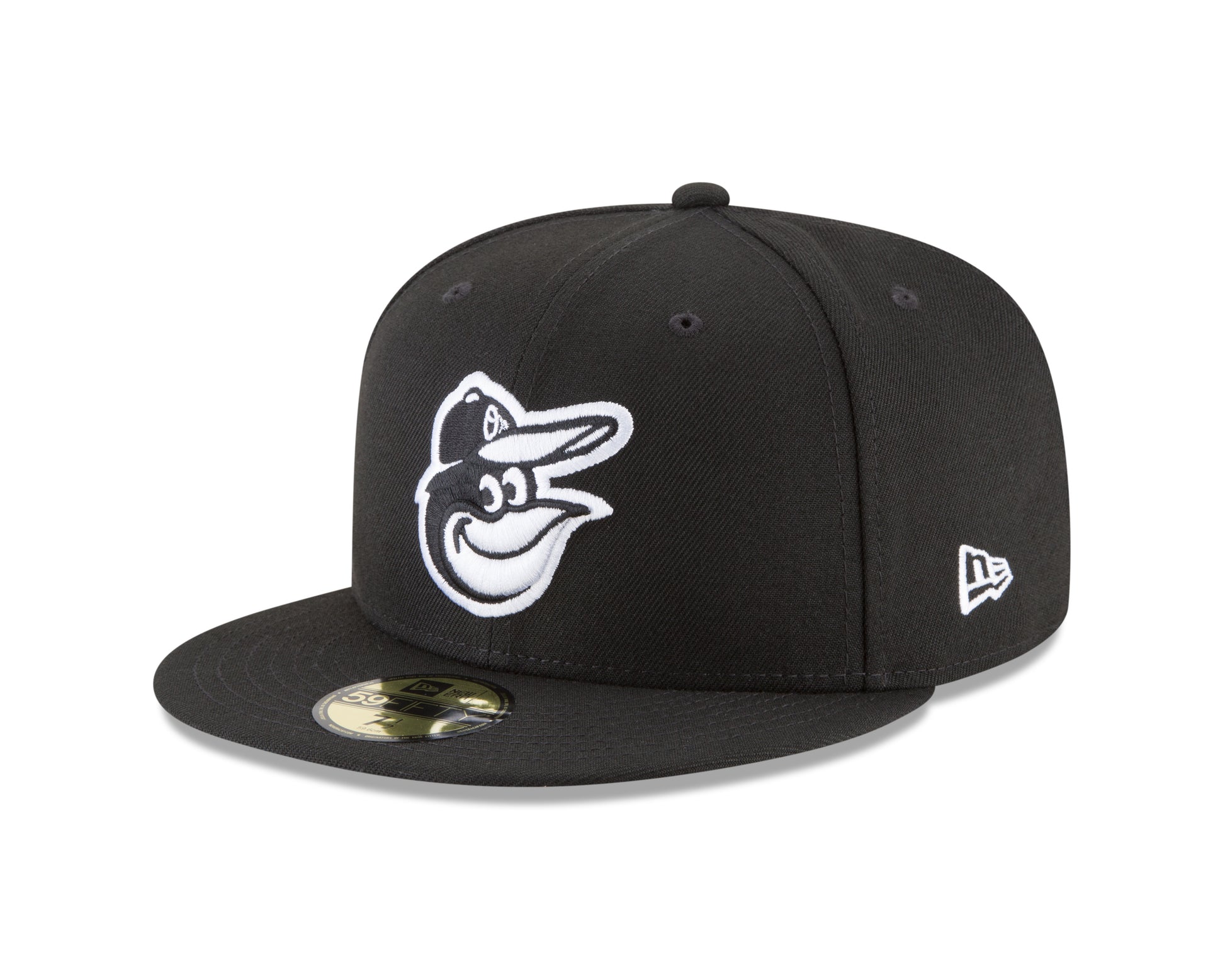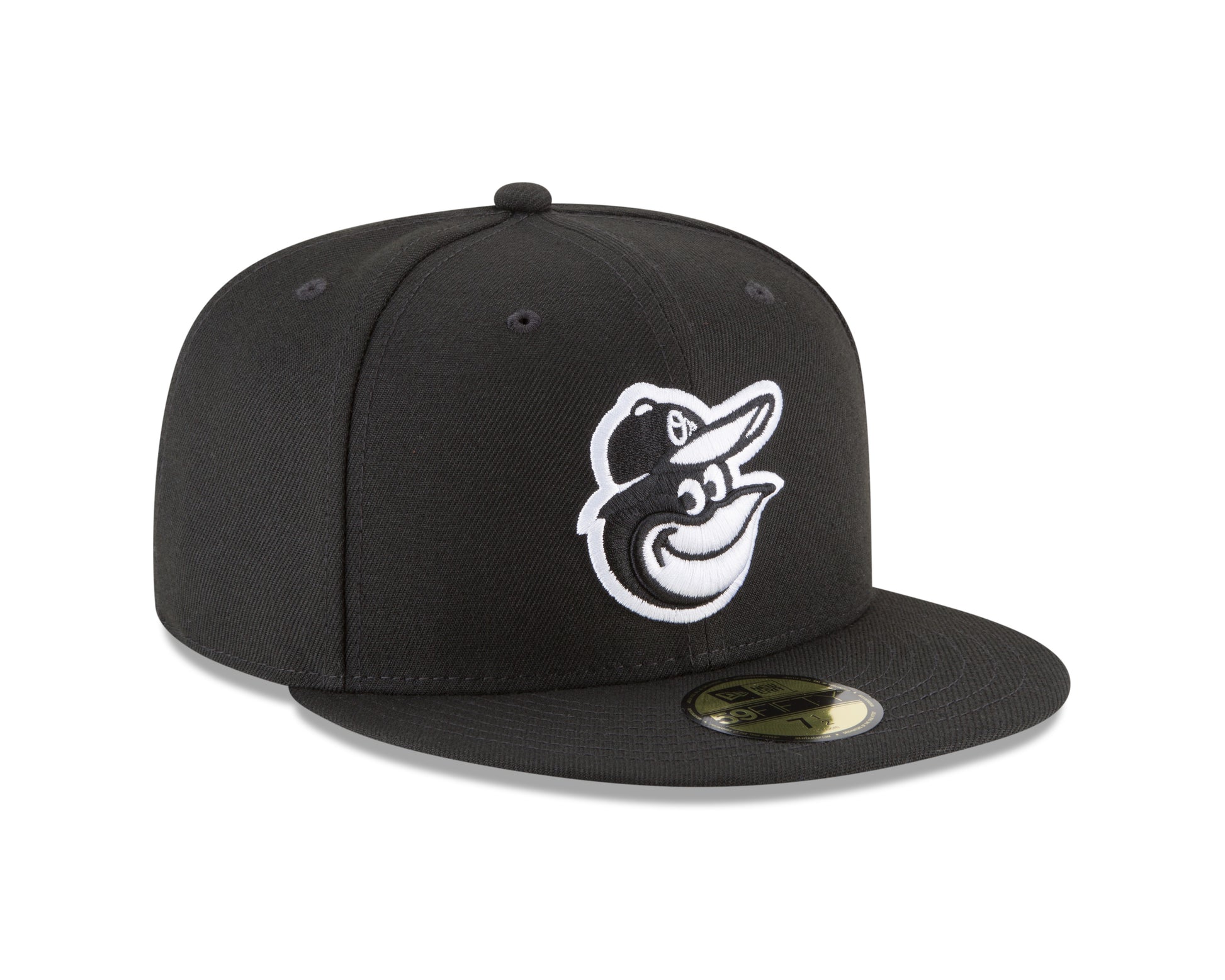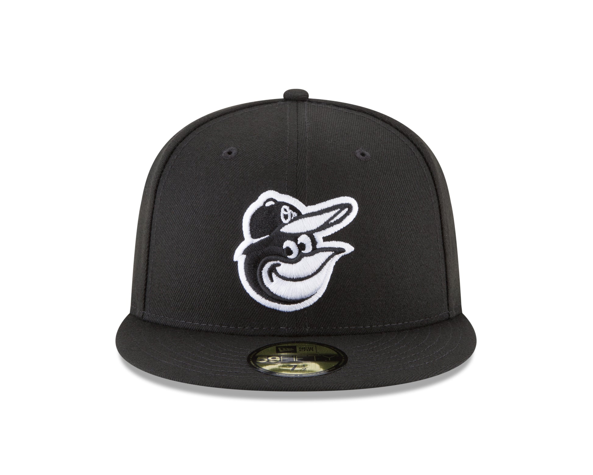Orioles Fans!! Sport this New Era Baltimore Orioles Basic Black & White 59FIFTY fitted hat, This fitted hat features a 3D embroidered Orioles logo on crown and MLB logo on the back along with a flat bill The 59FIFTY® cap is New Era's signature fitted cap. It is a structured cap with a flat visor, that has the ability to curve. The 59FIFTY® cap has a full crown and six panels. The cap has eight rows of visor stitching and a button on top.