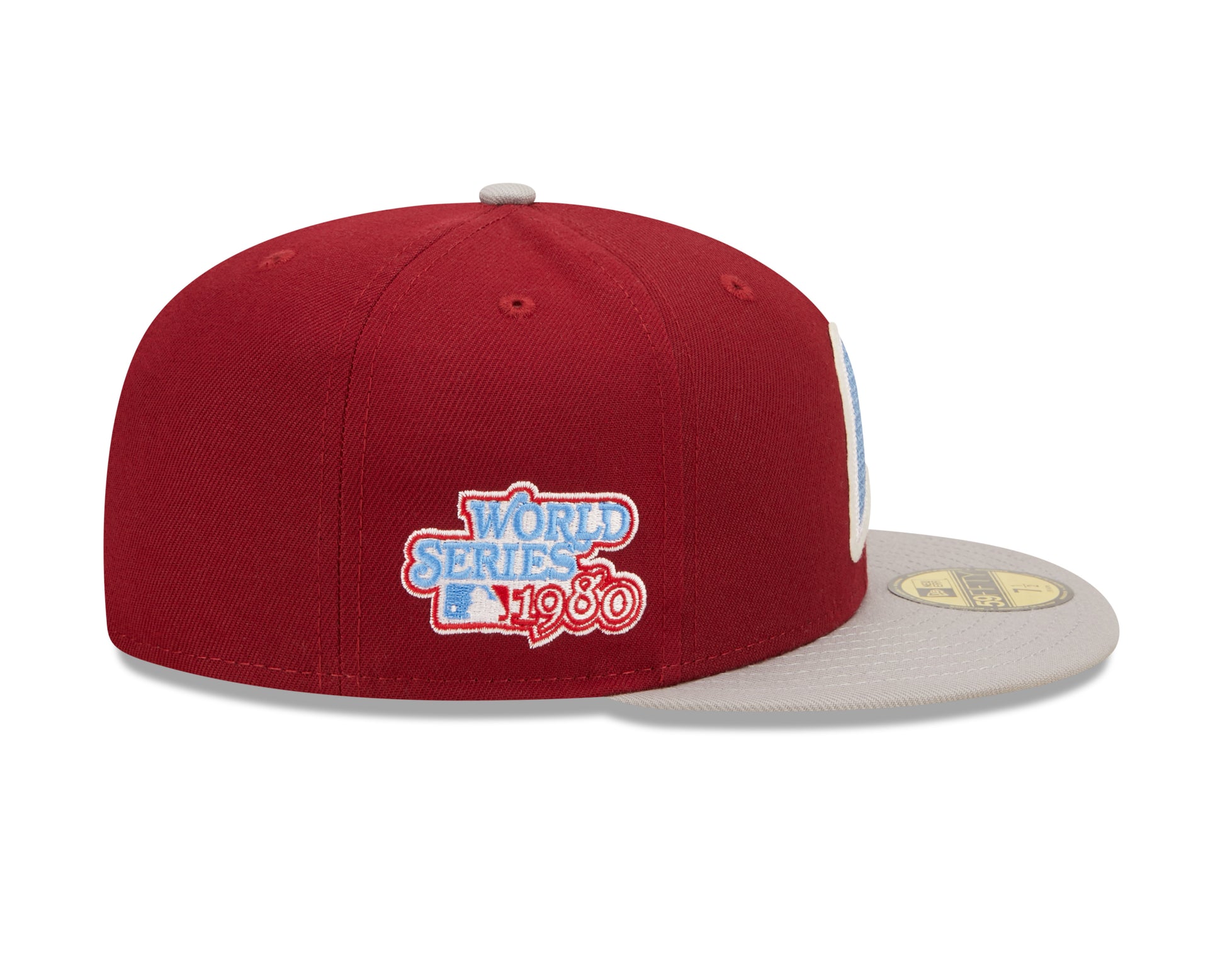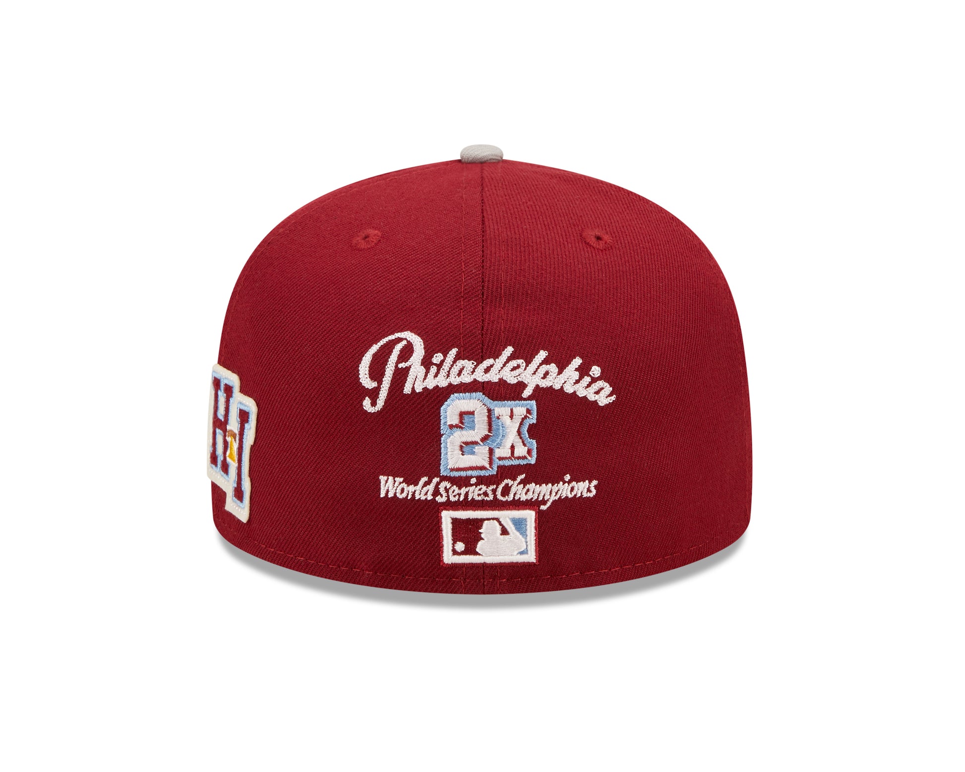 Show off in this Letterman Patched 59FIFTY Fitted hat. This fitted hat features Phillies logo on the front crown. World Series graphics representing true team Pride. City specific graphics on the left side. MLB logo on the back along with World Series champtionship numbers. The 59FIFTY® cap is New Era's signature fitted cap. It is a structured cap with a flat visor, that has the ability to curve. The 59FIFTY® cap has a full crown and six panels. The cap has eight rows of visor stitching and a button on top.