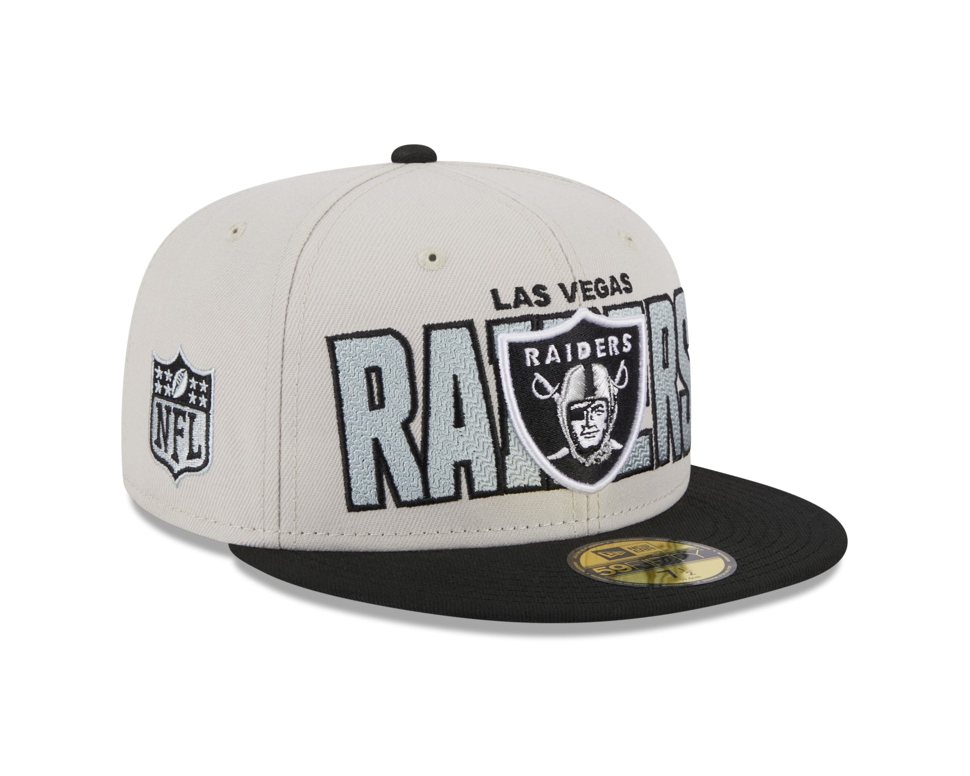The Las Vegas Raiders 2023 Draft 59FIFTY Fitted Cap features an embroidered Raiders wordmark and logo at the front panels, matching NFL Shield at the right-wear side, team logo at the rear, and a gray undervisor.