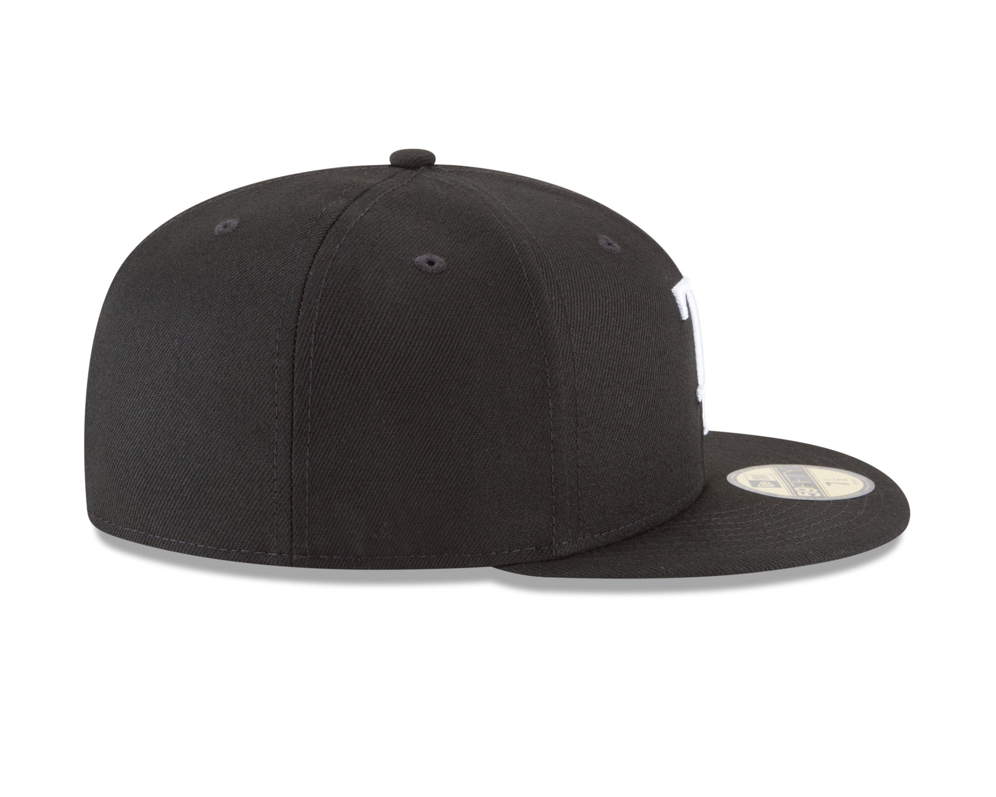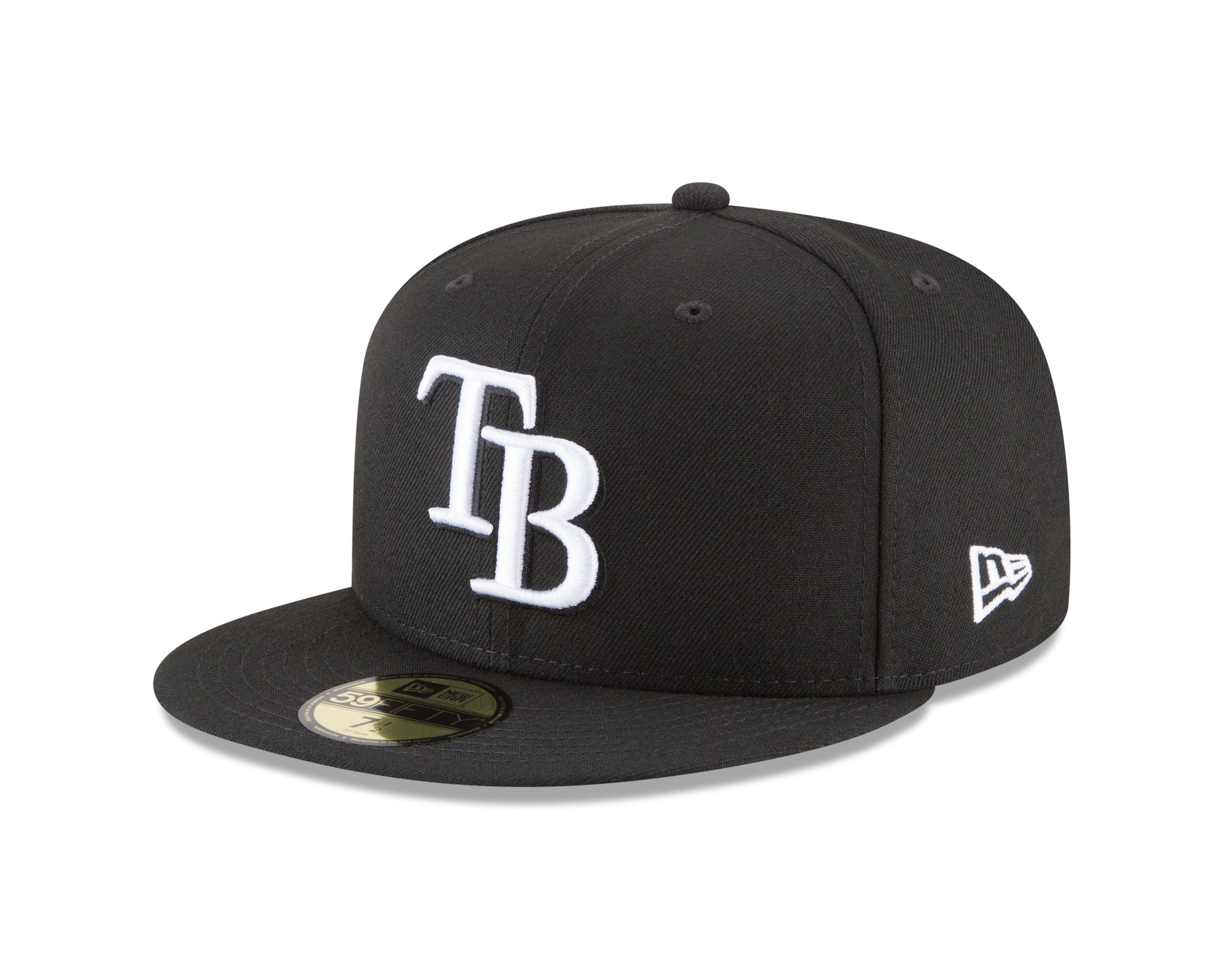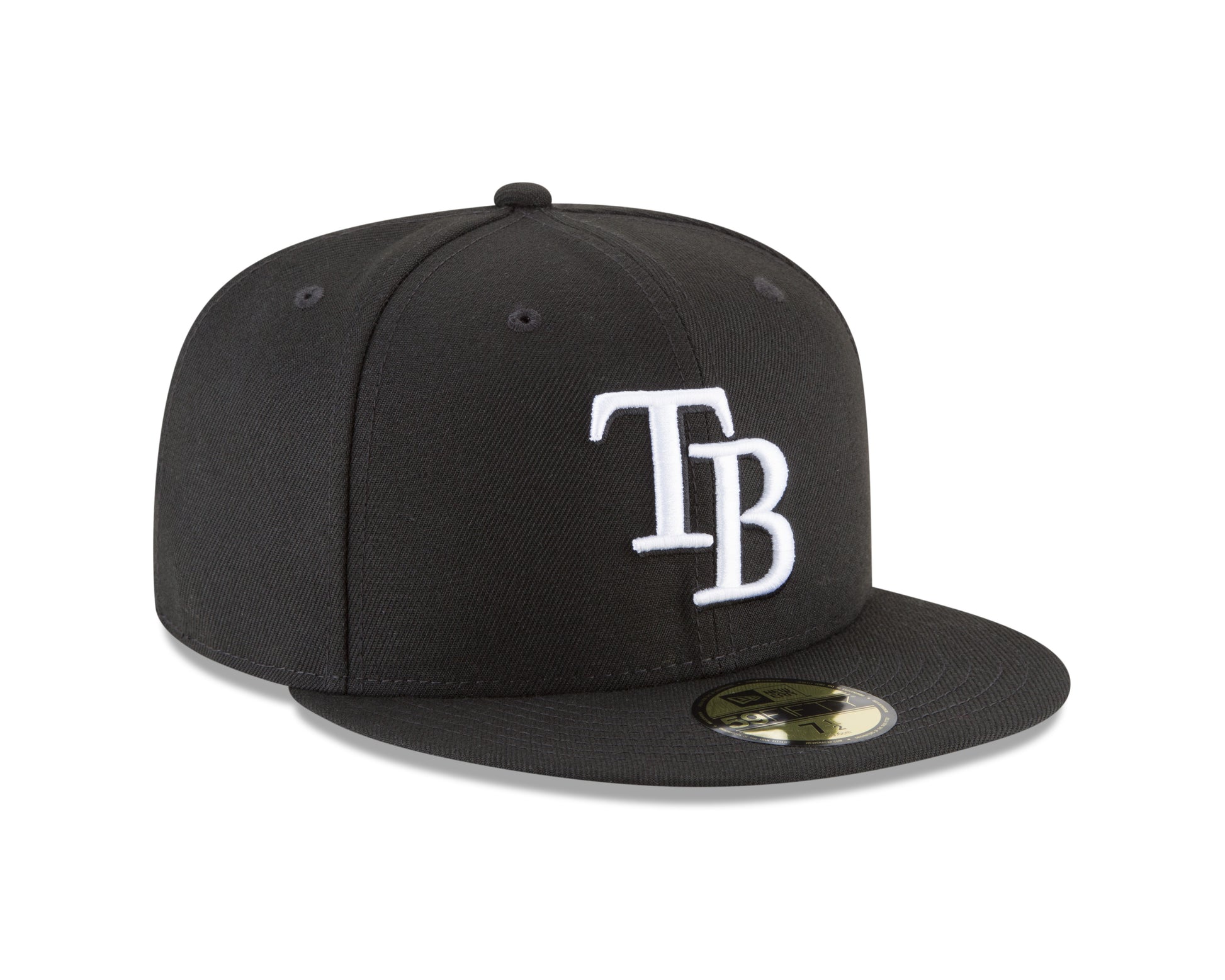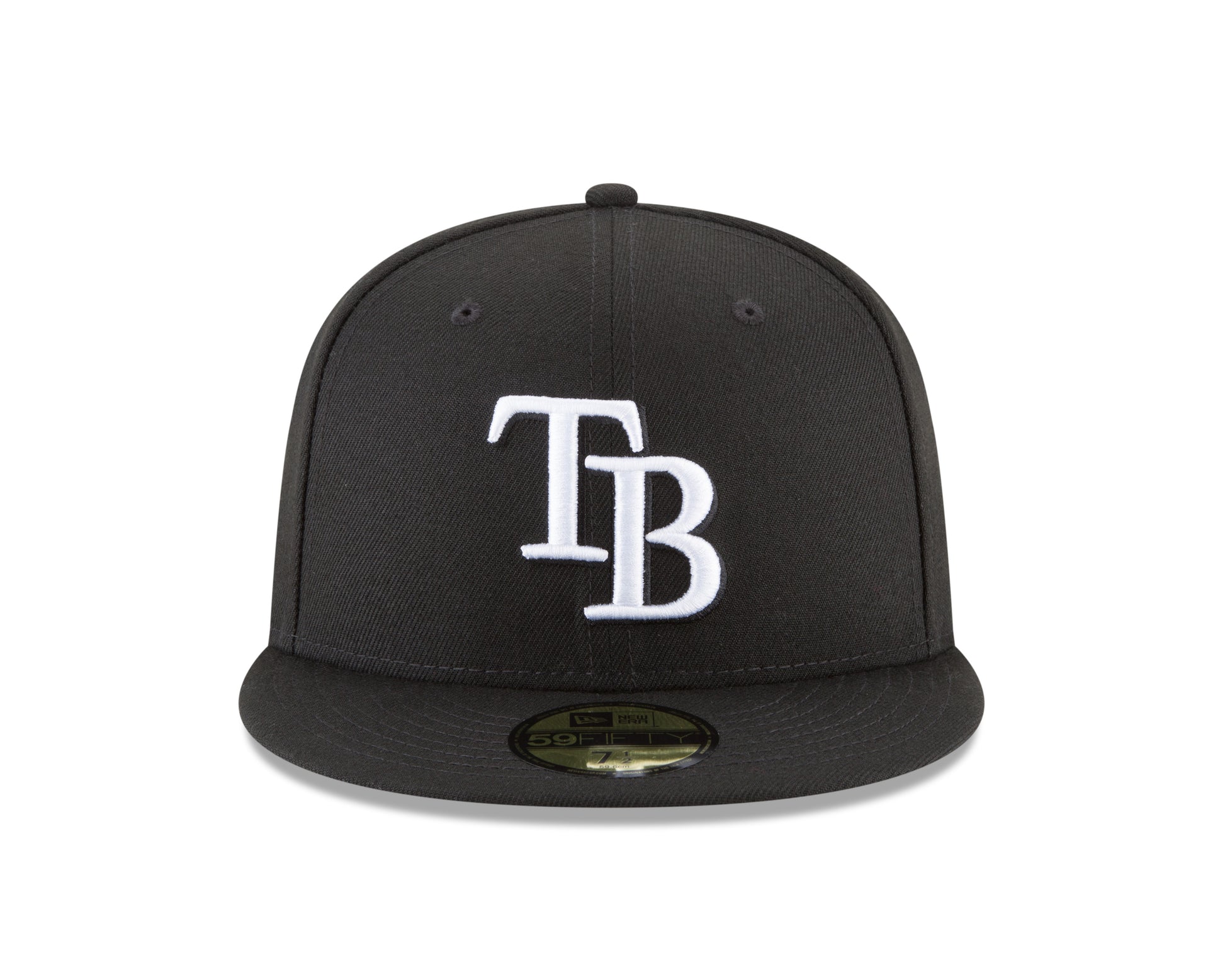 Rays Fans !!. Show off in this Basic Black on Black 59FIFTY Fitted hat. This fitted hat features Yankees tonal black & White on the crown and MLB logo on the back . So don't just dream about those Yankees wear one for yourself. The 59FIFTY® cap is New Era's signature fitted cap. It is a structured cap with a flat visor, that has the ability to curve. The 59FIFTY® cap has a full crown and six panels. The cap has eight rows of visor stitching and a button on top.