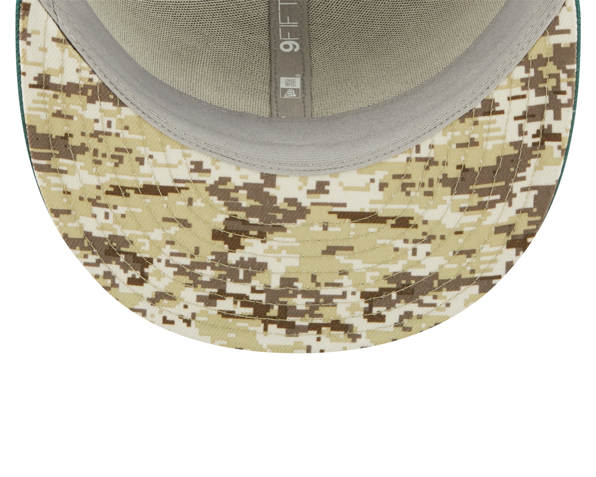 Salute to Service 9FIFTY Snapback features an embroidered team logo and team banner at the front panels with the official NFL Salute to Service patch above a snapback closure at the rear. Additional details include an American flag patch at the right-wear side, a team color brim, and a camo print undervisor.