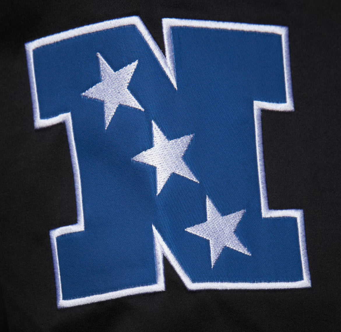 Channel your inner hero with this Black Out Full-Snap Satin Jacket from Mitchell & Ness. This heavyweight jacket is crafted from a luxurious satin-finished polyester and features a classic rib-knit collar, cuffs, and waistband for a timeless look. Show off your team pride with the bold embroidered applique graphics on the front and team wordmark across the back.Â