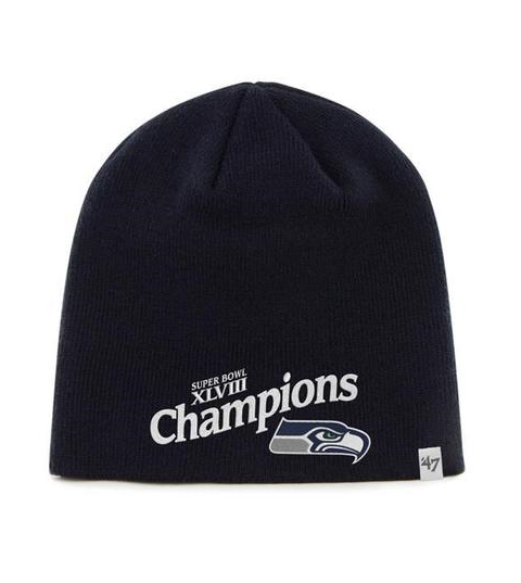 NFL knit hat from 47' Brand This awesome hat features team embroidered logo on front along with the Super Bowl XLVIII Champions patch. Manufactured by New Era and officially licensed.