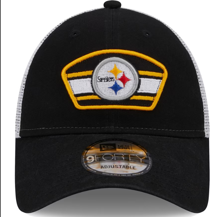 Steelers Fans! You'll want to sport this brand new Logo Patch Trucker Mesh 9Forty Adjustable Snap back Cap. This cap features Patched logo in front. with adjustable snap back. Breathable mesh back with New Era logo on left side.