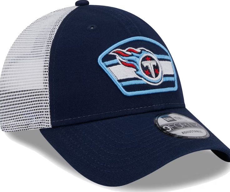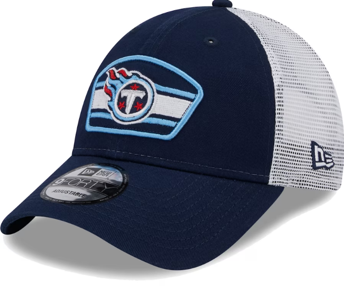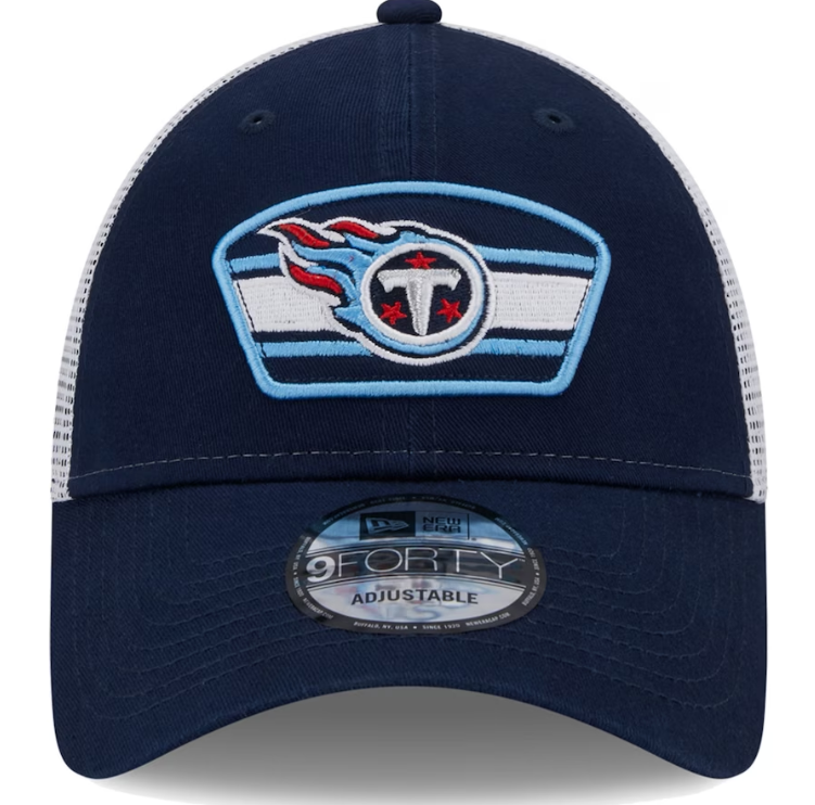 Titans Fans! You'll want to sport this brand new Logo Patch Trucker Mesh 9Forty Adjustable Snap back Cap. This cap features Patched logo in front. with adjustable snap back. Breathable mesh back with New Era logo on left side.