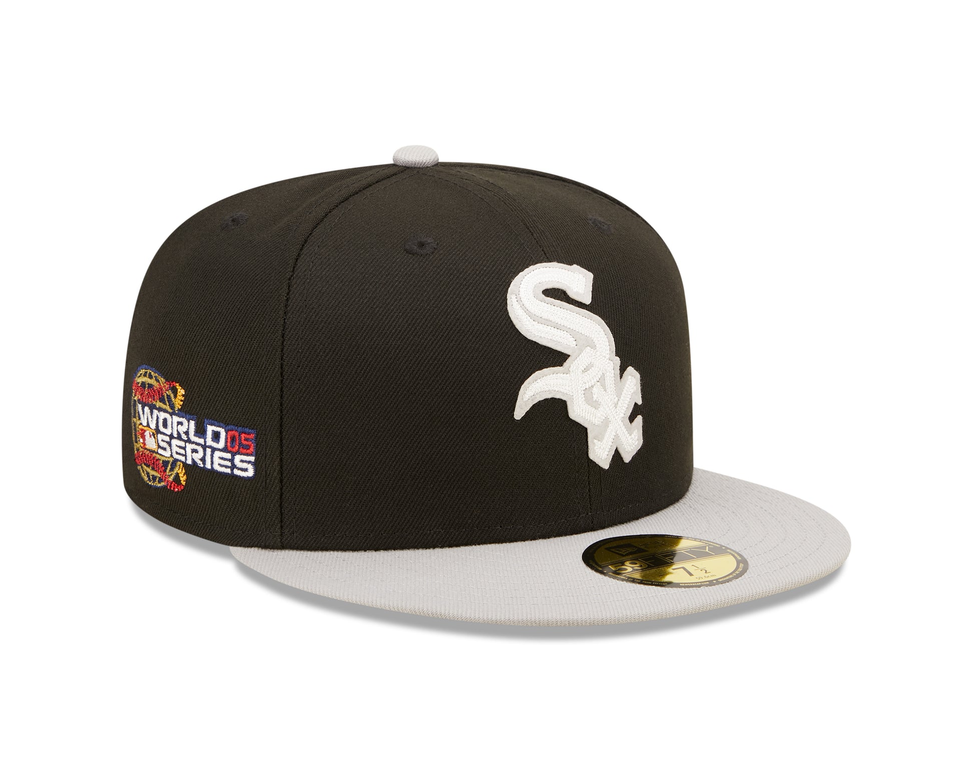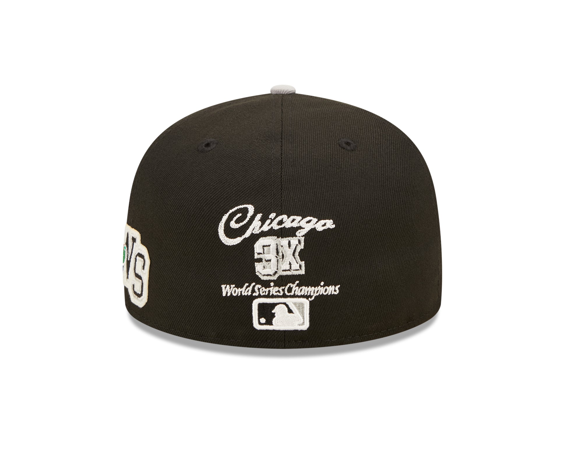 Show off in this Letterman Patched 59FIFTY Fitted hat. This fitted hat features White Sox logo on the front crown. World Series graphics representing true team Pride. City specific graphics on the left side. MLB logo on the back along with World Series champtionship numbers. The 59FIFTY® cap is New Era's signature fitted cap. It is a structured cap with a flat visor, that has the ability to curve. The 59FIFTY® cap has a full crown and six panels. The cap has eight rows of visor stitching and a button on top.